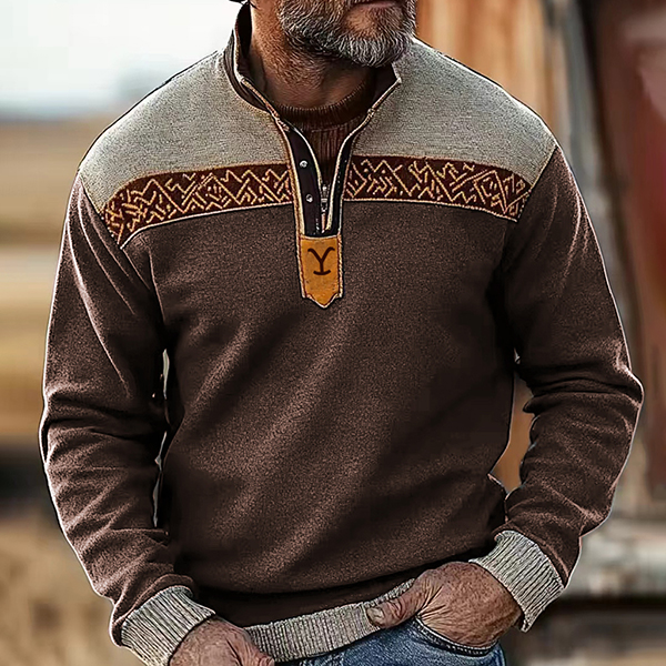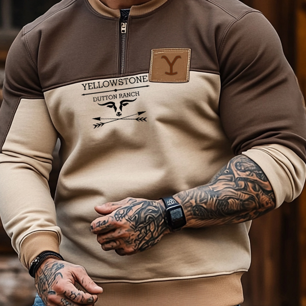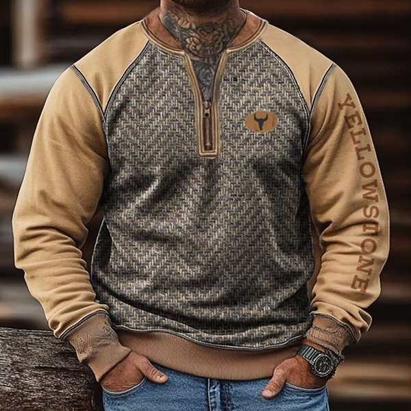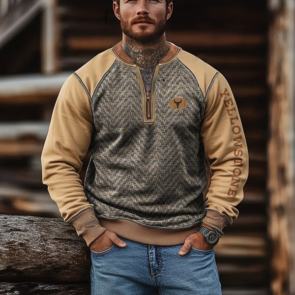 Men's Retro Yellowstone Herringbone Fabric Splicing Zipper Collar Outdoor Color Blocks Sweatshirt