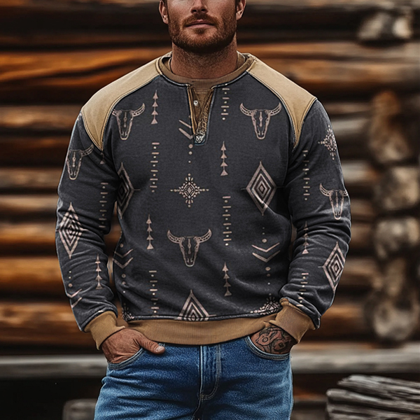 Men's Outdoor Vintage Color Blocks Aztec Cow Print Casual Henley Sweatshirt