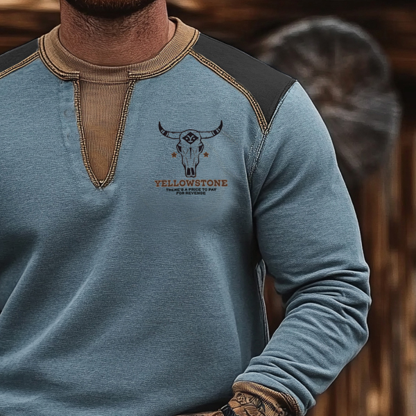 Men's Outdoor VintageWestern Bull Skull Print Casual Henley Sweatshirt