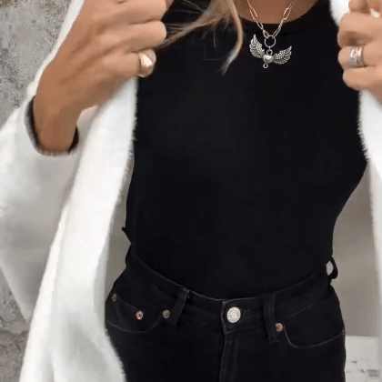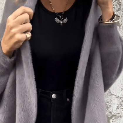 ✔️ Flowing, elongated design: drapes beautifully around the body, creating a soft and flattering winter look.
